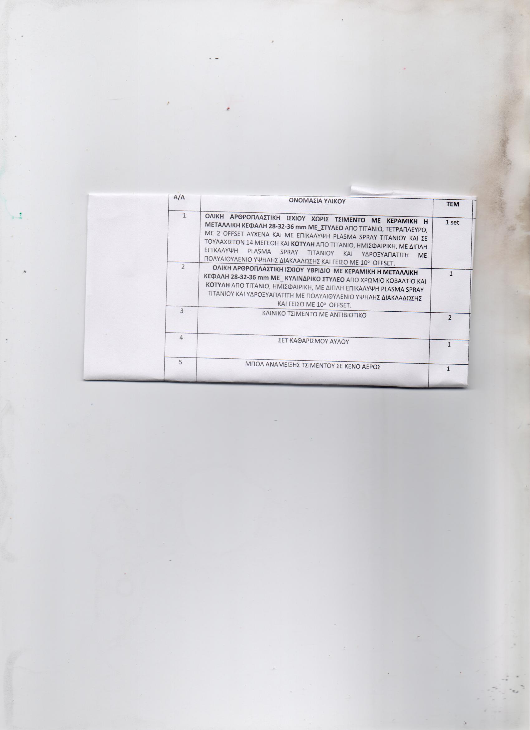 ΟΛΙΚΗ ΑΡΘΡΟΠΛΑΣΤΙΚΗ ΙΣΧΙΟΥ ΧΩΡΙΣ ΤΣΙΜΕΝΤΟ/ΟΛΙΚΗ ΑΡΘΡΟΠΛΑΣΤΙΚΗ ΙΣΧΙΟΥ ΥΒΡΙΔΙΟ /ΚΛΙΝΙΚΟ ΤΣΙΜΕΝΤΟ ΜΕ ΑΝΤΙΒΙΩΤΙΚΟ/ΣΕΤ ΚΑΘΑΡΙΣΜΟΥ ΑΥΛΟΥ/ΜΠΟΛ ΑΝΑΜΕΙΞΗΣ ΤΣΙΜΕΝΤΟΥ ΣΕ ΚΕΝΟ ΑΕΡΟΣ (ΑΕ:2709)